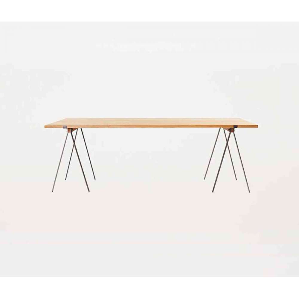 Koziołki firmy Frama pasują do zwykłego blatu stołu. Wraz z kozłami znajduje się prosty metalowy wspornik górny. Kontynuując podejście do projektowania kolekcji, kozły mają industrialny wyraz, wraz z prostym, ale funkcjonalnym złączem ułatwiającym montaż. Użyj. Kozły do stworzenia szafki na biurko lub większego stołu jadalnego. Uwaga: Koziołki można również kupić razem z litymi deskami dębowymi.