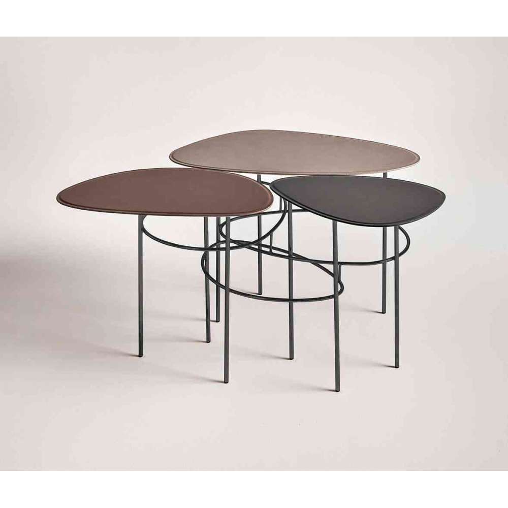 Zestaw stolików akcentowych dostępny w wersji 3 i 5 blatów. Konstrukcja pręta z wykończeniem z polerowanego chromu lub mosiądzu, blaty w całości pokryte skórą siodłową.