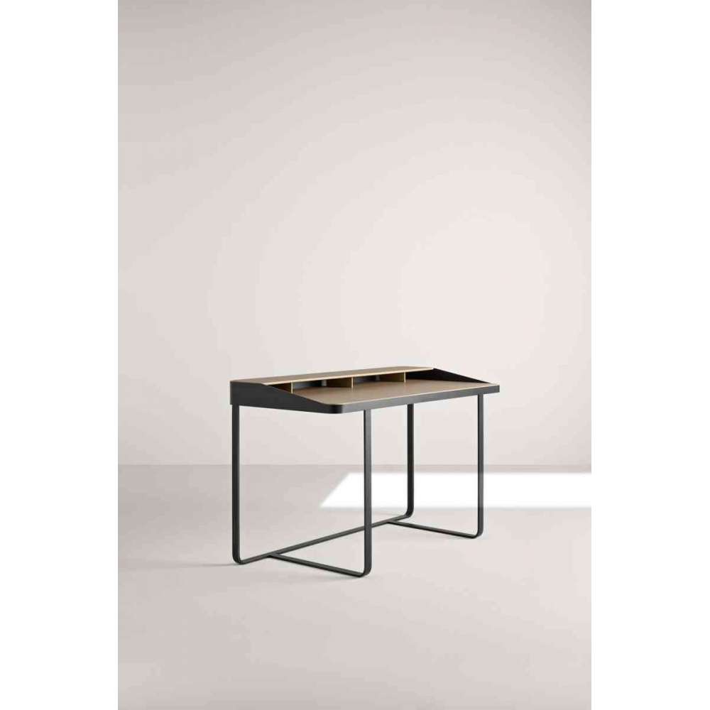 Biurko z lakierowaną ramą ze szczotkowanej stali i dwupoziomowym blatem pokrytym skórą.