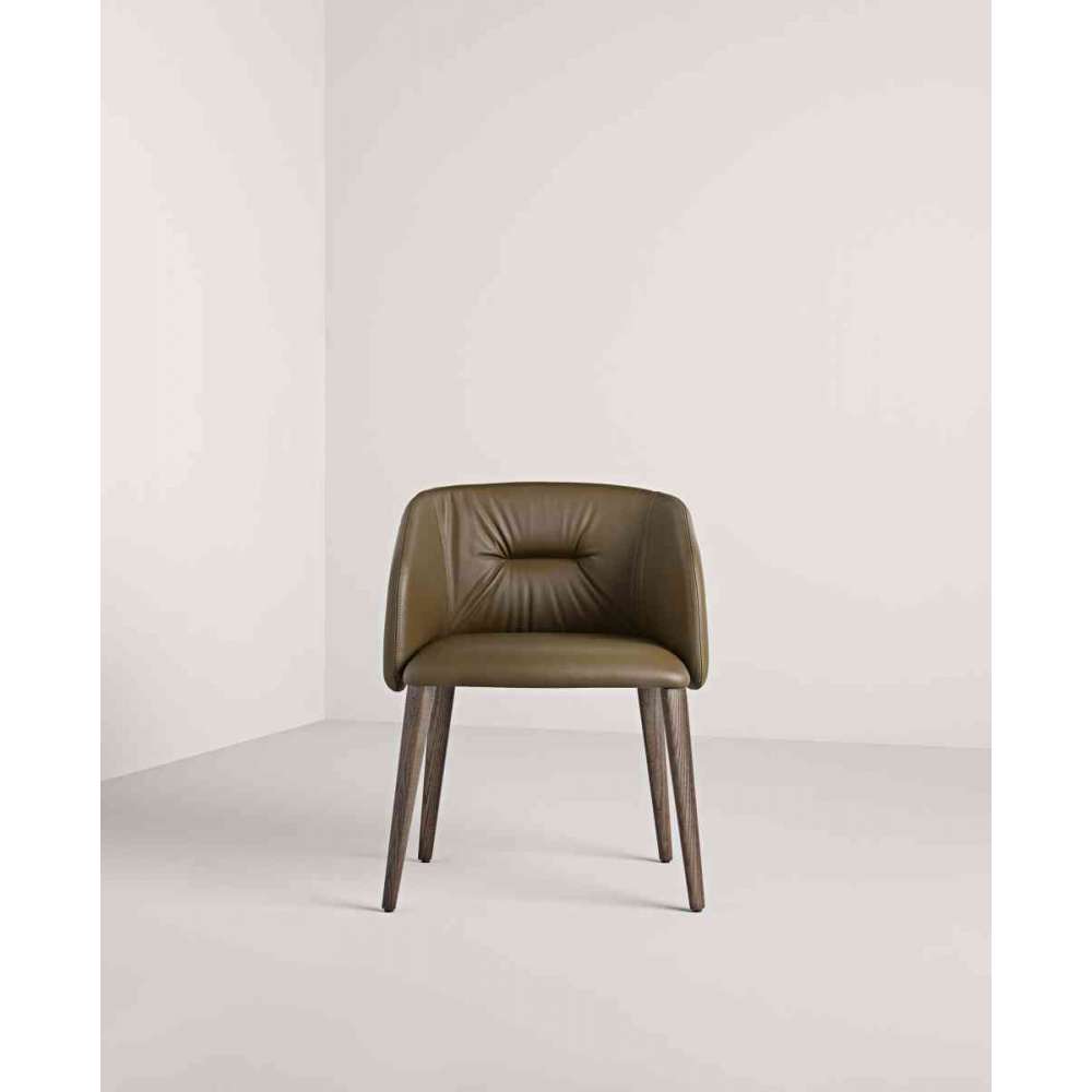Fotel z wielowarstwową skorupą wyściełaną trudnopalną pianką poliuretanową i tapicerką skórzaną. Nogi z drewna jesionowego.
