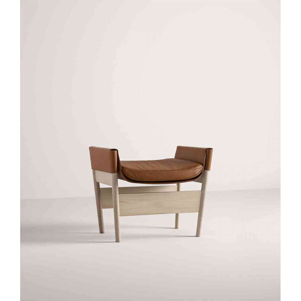 Fotel z ramą z drewna bukowego. Samonośne siedzisko, oparcie i podłokietniki wykonane ze skóry licowej. Poduszki siedziska, zagłówka i podparcia odcinka lędźwiowego z pianki i watoliny, tapicerowane skórą. Pufa z ramą z drewna bukowego i samonośnym siedziskiem ze skóry licowej z poduszką z gęsiego puchu, tapicerowana skórą.