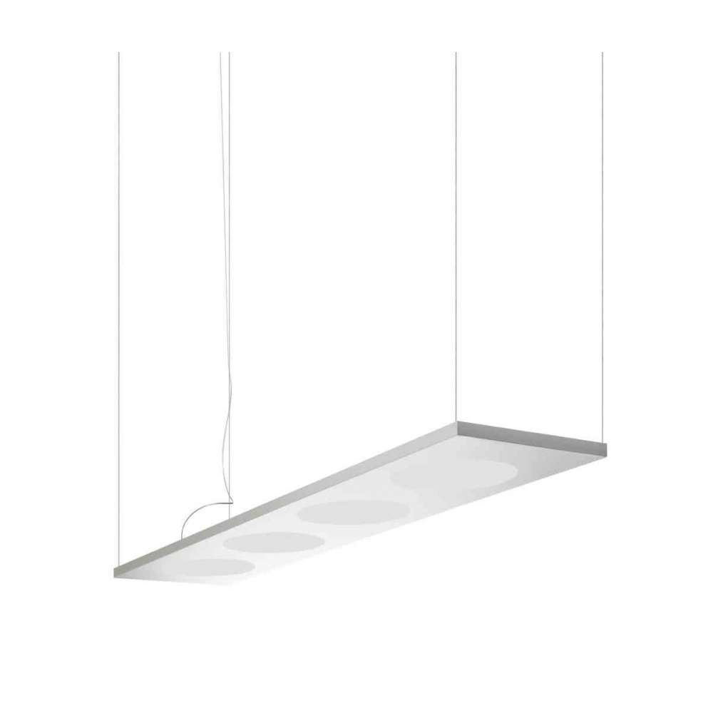 Lampa wisząca ze światłem bezpośrednim i pośrednim. Lampa składa się z wycinanej laserowo blachy aluminiowej giętej za pomocą giętarki ciśnieniowej i ręcznie wykańczanej. Aluminium jest anodowane, a następnie powlekane płynnie przezroczystym lakierem lub kolorową farbą. Mamy tutaj dwa opalizowane dyfuzory z PMMA, przedni lekko tłoczony. Pomiędzy dwoma dyfuzorami znajduje się płyta - również z przezroczystego PMMA, która rozprasza światło z multichipowych diod LED zainstalowanych na dłuższych bokach aluminiowej ramy. Płyta jest grawerowana laserowo w obszarach wyrównanych z iluminatorami, aby skoncentrować odbicie światła. Linka zwieszakowa ze stali nierdzewnej i przezroczysty kabel elektryczny. Daszek sufitowy z ocynkowanym wspornikiem metalowym i osłoną ABS barwioną w masie na biało.