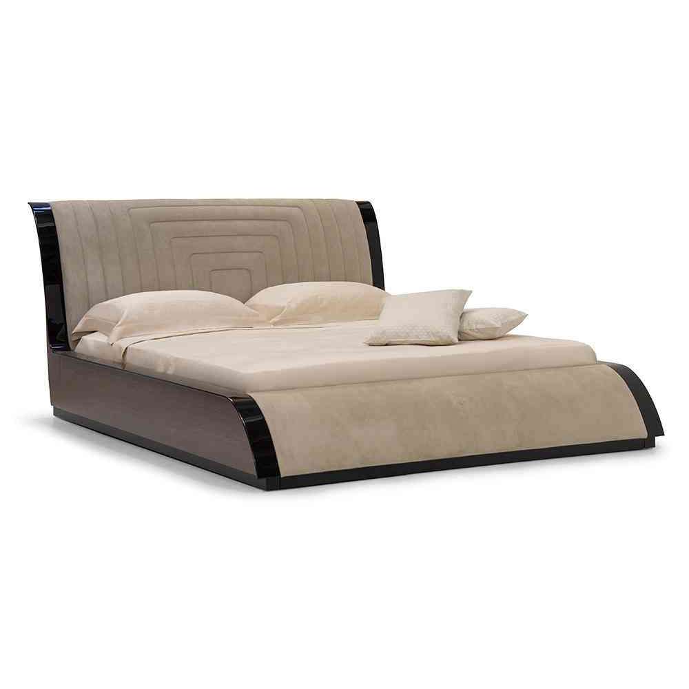Łóżko, wezgłowie tapicerowane pikowaną skórą naturalną z unikalnym wzorem na wezgłowiu i wytłoczonym logo na podnóżku, rama w metalicznym wykończeniu.