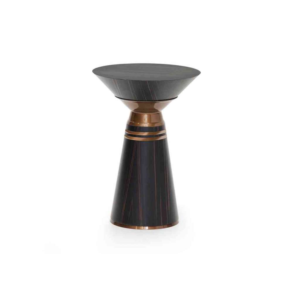 Stolik końcowy w fornirze hebanowym z metalicznym wykończeniem.