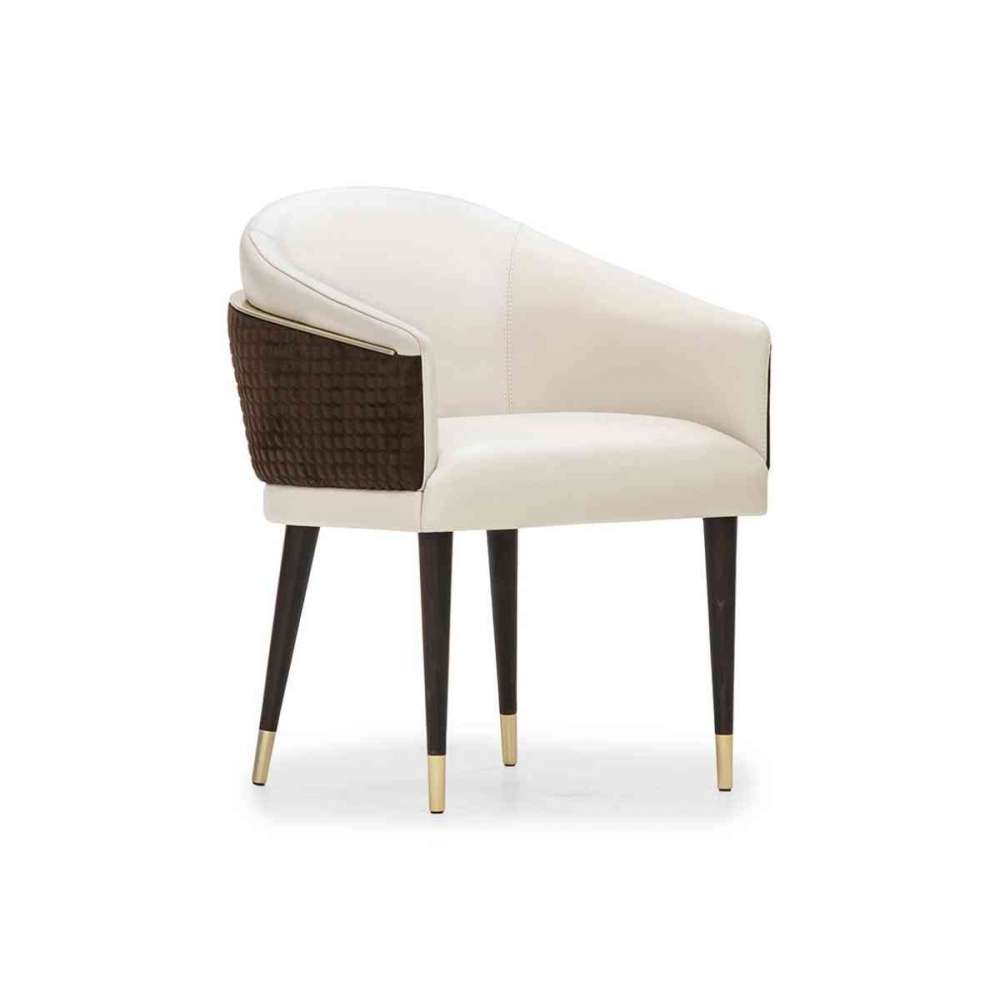 Krzesło do jadalni, tapicerowane skórą naturalną, zewnętrzny panel tylny z pikowanego technozamszu z detalami w metalicznym wykończeniu, lakierowane nogi z metalowymi nakładkami.