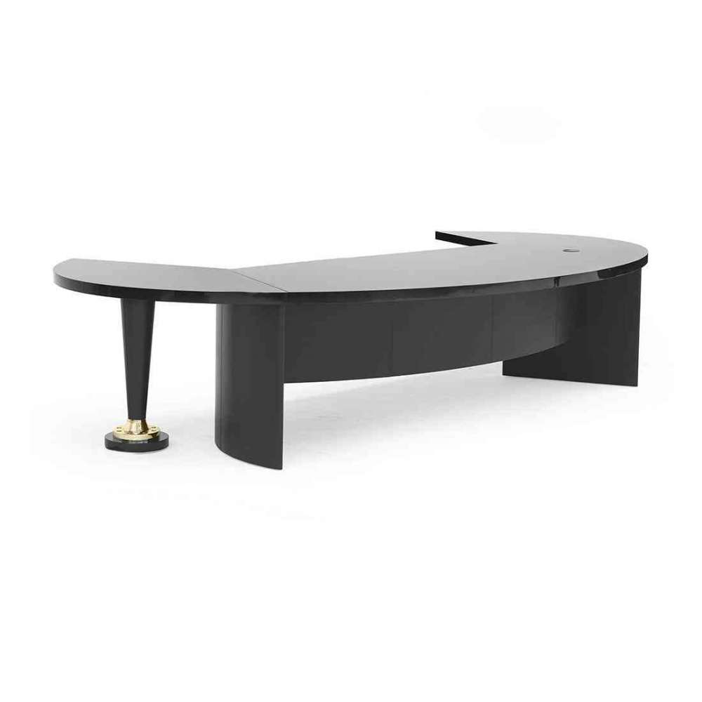 Blat i podstawa biurka z lakierowanego drewna w kolorze czarnym błyszczącym, nogi, panel przedni i boki ze skóry muflonu w kolorze czarnym.