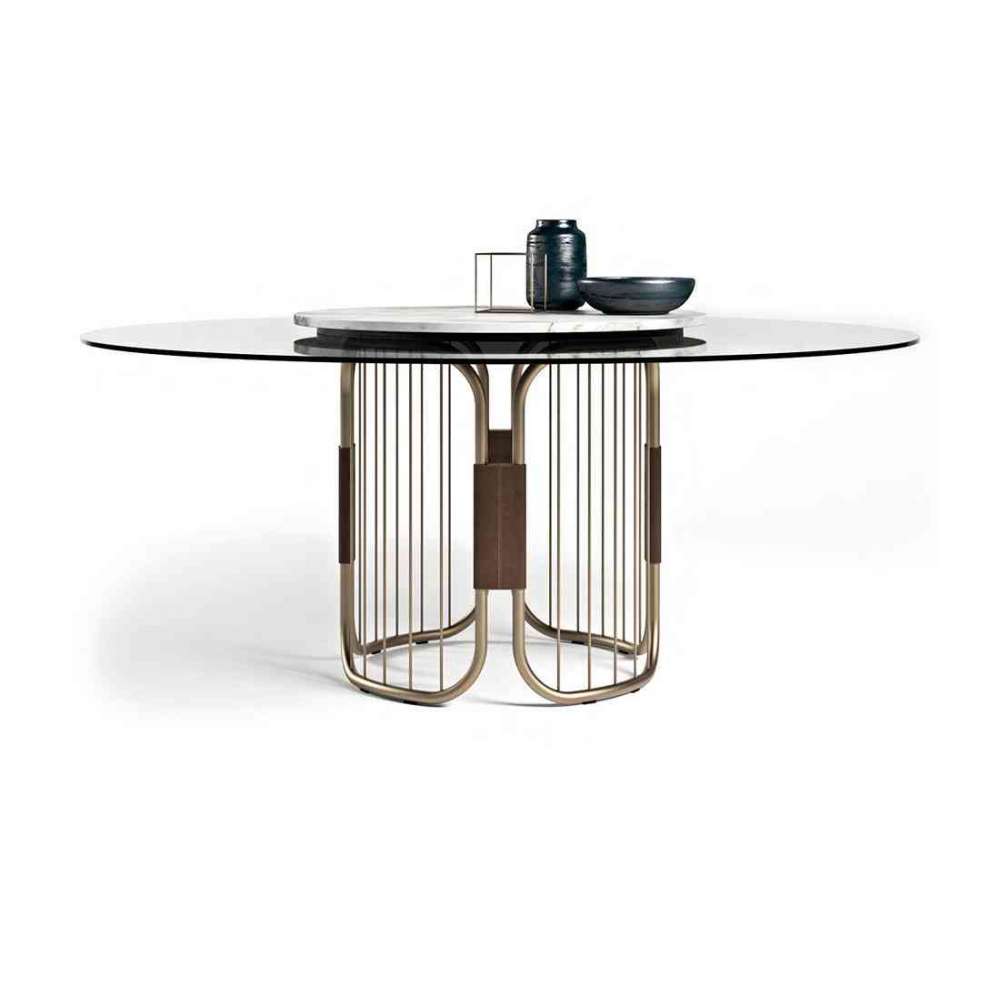 Szklany blat. Leniwa Zuzanna w marmurze. Metalowa podstawa ze skórzanymi detalami.