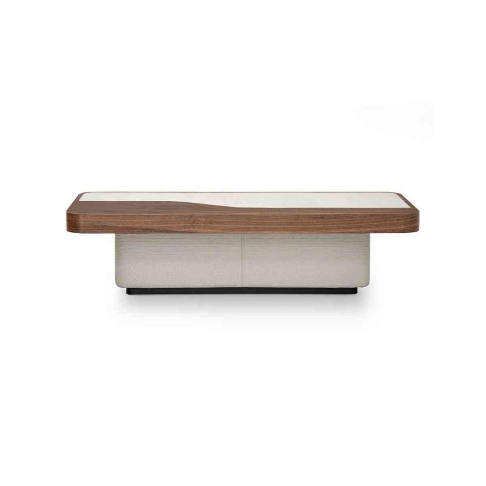 Blat w okleinie Venice mat, górna wstawka ze skóry Daino kol. Oyster, podstawa ze skóry Daino kol. Ostryga z nadrukiem „Small Tress”.
