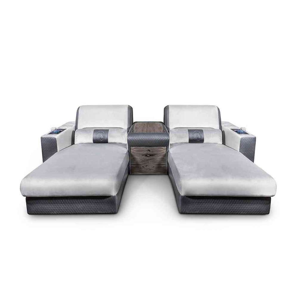 Kino domowe DUSTIN można w pełni dostosować za pomocą szerokiej gamy prestiżowych materiałów, takich jak skóry, marmury i wyjątkowe aksamity