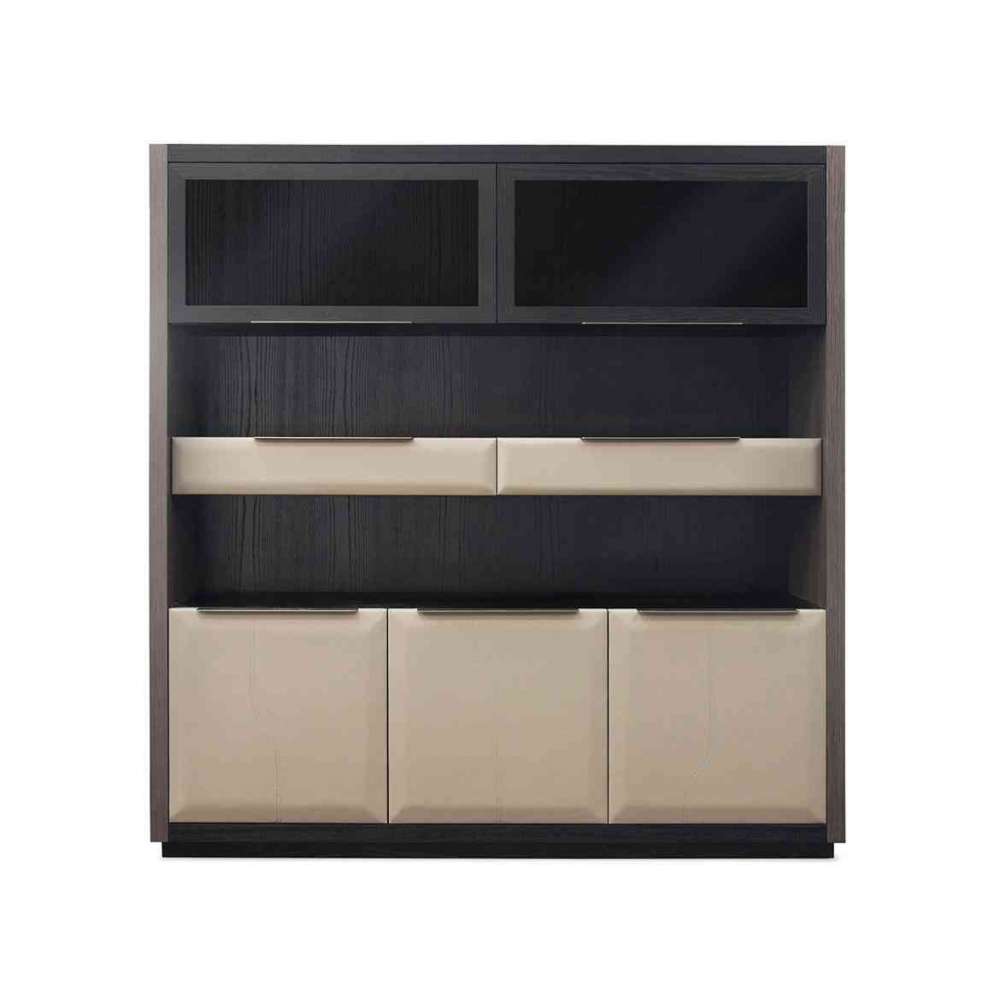 Boki w okleinie Dąb tytanowy z otwartymi porami, półki i panel tylny w okleinie Jesion kol. czarne otwarte pory, fronty drzwi i szuflady ze skóry Daino kol. Błoto, górne szklane drzwi kol. fumé z drewnianą ramą w kolorze drewna jesionowego kol. czarny otwarte pory, metale kol. Goldchamp S mat.