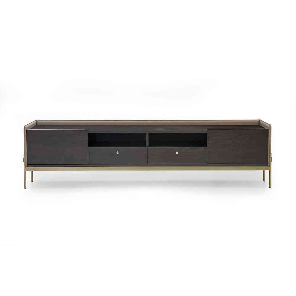 Blat i fronty szuflad i drzwi w okleinie Moka w kolorze Ash Stained, struktura i klapy w skórze Cuoio kol. Ciemnoszary, metalowa konstrukcja i metalowy uchwyt z logo AM w kolorze jasnego złota.