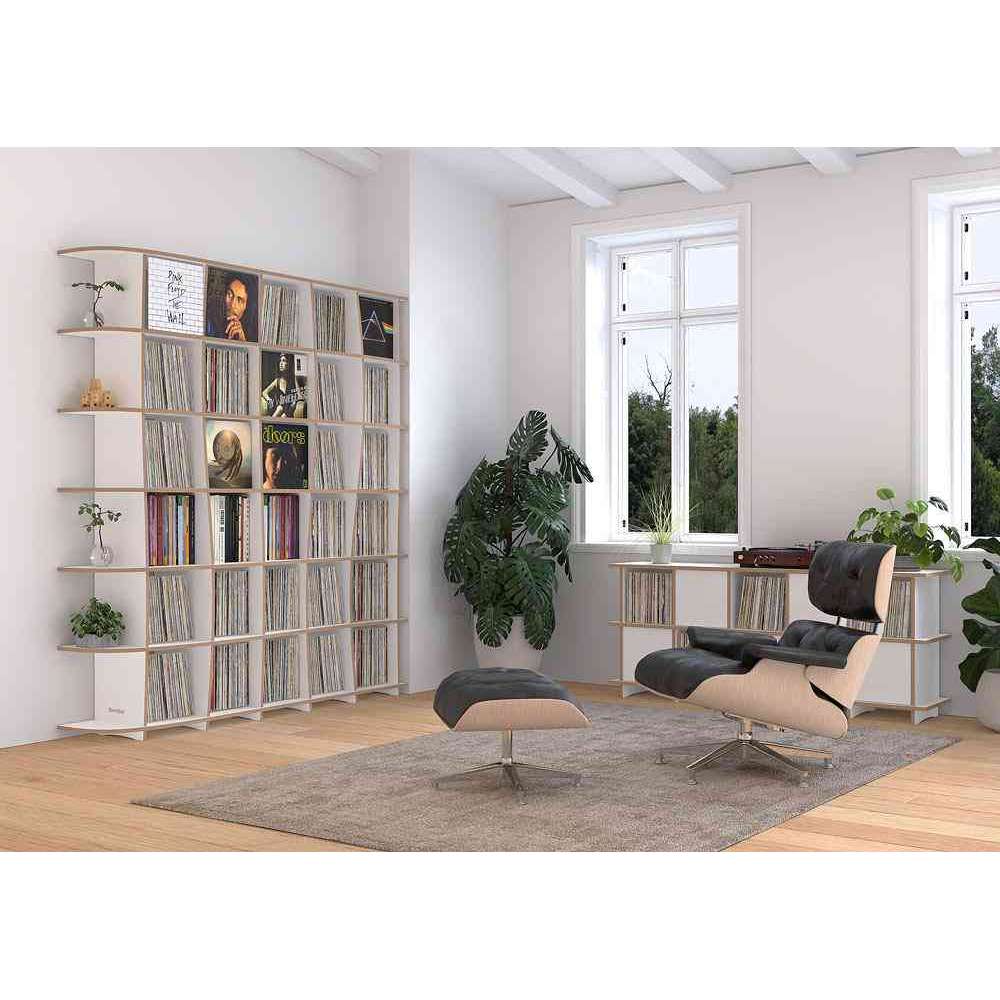 Półka na płyty Biggie z lekkim odchyleniem zapewnia dużo miejsca do przechowywania bogatej kolekcji płyt.