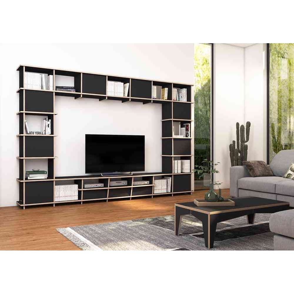 Meblościanka Yuma składa się z szafki pod telewizor, dwóch szafek bocznych oraz wiszącej półki ściennej. W połączeniu tworzą idealną meblościankę pod telewizor do salonu. Dzięki łącznie 25 przegródkom mebel zapewnia wystarczająco dużo miejsca do przechowywania urządzeń elektrycznych, takich jak telewizor, amplituner, system hi-fi, konsola do gier wideo i DVD. Naprzemienne drzwi Tip-On można ustawić indywidualnie, a kolor mebli dopasować do przestrzeni mieszkalnej. W zależności od konstrukcji, duże wnęki i długie wysięgi można wyposażyć w uchwyty ścienne.