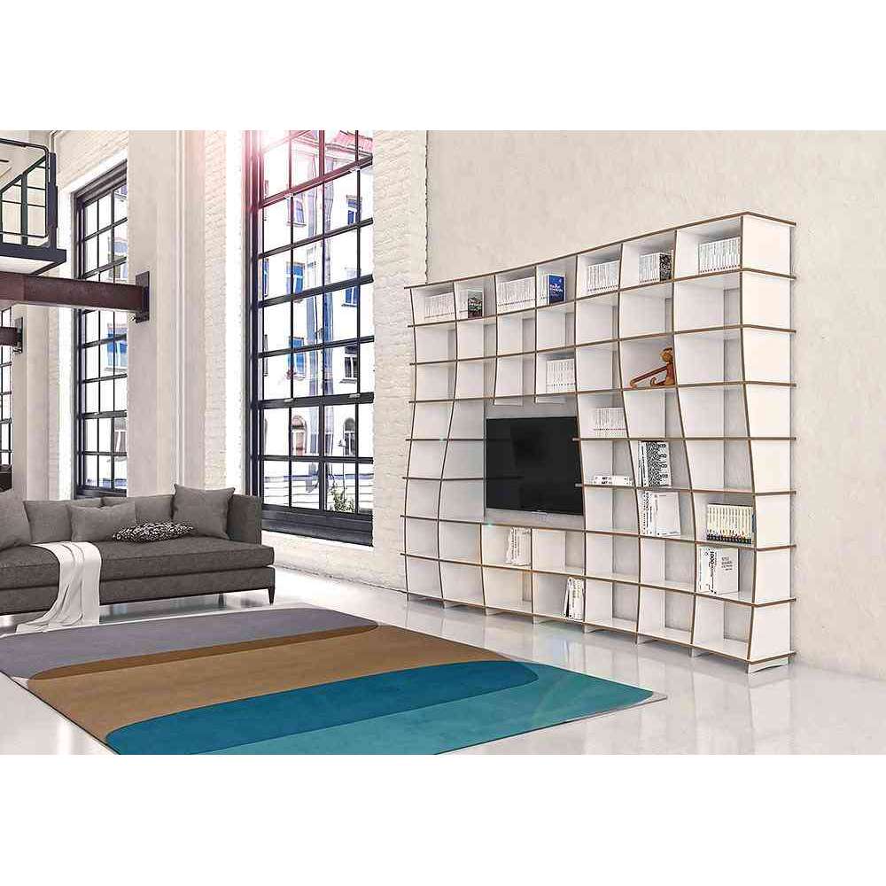 Nasza zakrzywiona ściana dzienna Manni sprawi, że Twój salon będzie przyciągał wzrok. Wyróżnia się nie tylko harmonijnym i zakrzywionym designem, ale także szeroką gamą przestrzeni do przechowywania. ok. 1,37 m szerokości i 0,94 m wysokości wnęka pod telewizor zapewnia wystarczająco dużo miejsca na 58-calowy telewizor. W naszym intuicyjnym konfiguratorze 3D dopasujesz wnękę pod telewizor do wielkości swojego telewizora. Całkowite wymiary meblościanki to (szer. x wys.) 3,40 m x 2,62 m. Łącznie w 47 przegródkach o wymiarach (szer. x wys.) 45 cm x 30 cm wyeksponujesz swoją kolekcję płyt DVD, książki lub inne rzeczy osobiste w jak najlepszym świetle. Nasza meblościanka Manni jest wykonana z płyty pilśniowej średniej gęstości (MDF) z miękkiego drewna bez kory. Dzięki wysokiej jakości powłoce z żywicy melaminowej materiał jest bardzo łatwy w utrzymaniu. Wolisz bardziej kolorową lub chciałbyś dopasować wymiary i formę do swojego domu? Następnie możesz optymalnie dostosować meble do swoich potrzeb i życzeń w naszym wielokrotnie nagradzanym konfiguratorze. Jeśli masz jakiekolwiek problemy lub pytania przy planowaniu swojego wyjątkowego mebla, nasz doświadczony zespół projektantów chętnie Ci pomoże i doradzi.