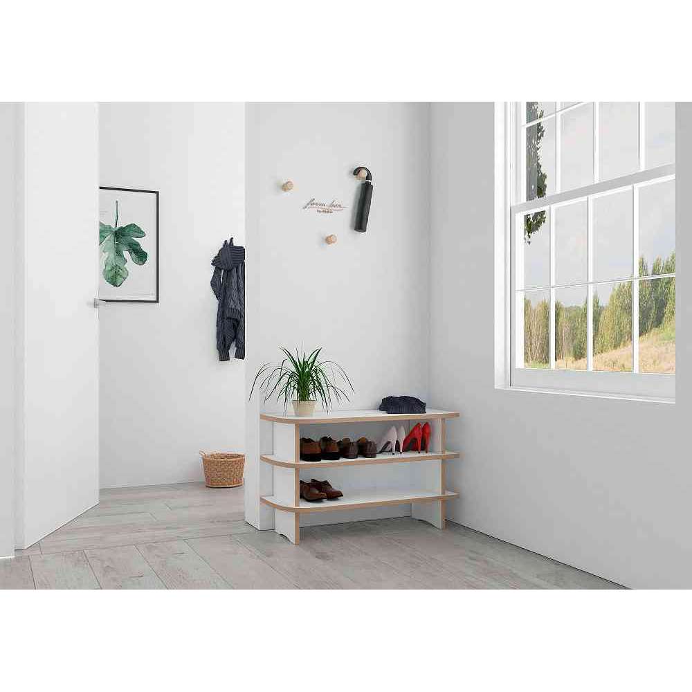 Mała, purystyczna półka na buty Anga oferuje wystarczająco dużo miejsca na 6 par butów. Jest jednocześnie praktyczny i oszczędza miejsce, dlatego idealnie nadaje się do małych i wąskich korytarzy. Dzięki liniowemu i prostemu wzornictwu zapewnia porządek w pomieszczeniu. Jeśli chcesz, możesz dopasować wymiary do swojej przestrzeni życiowej. Również materiał i formę można zmieniać w zależności od chęci i nastroju.