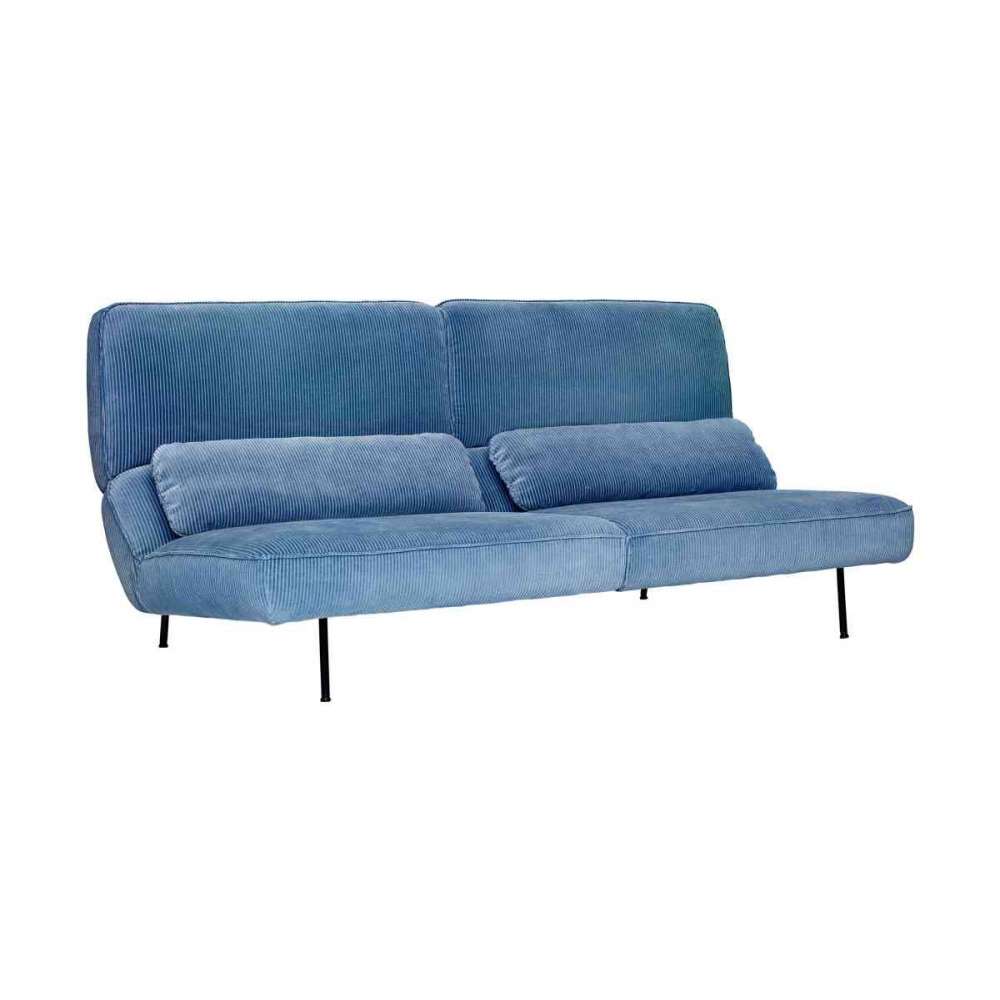 Sofa z metalową ramą malowaną proszkowo i stałą tapicerką z tkaniny.
