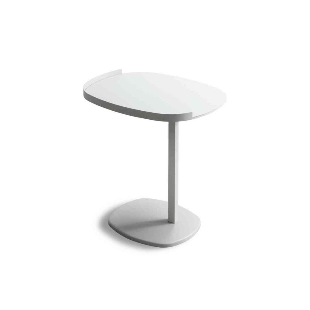 Lekki i minimalistyczny stolik kawowy o metalowej konstrukcji w następujących wykończeniach: anodowany brąz, biały, matowy oksydowany, czarny, szary, magma i ocean. Owalny blat wsparty jest na dwóch smukłych nogach centralnych lub pojedynczej przesuniętej względem środka stołu, co pozwala na łatwe ustawienie tej wersji obok łóżka lub sofy. Stabilność zapewnia drewniana podstawa lakierowana podobnie jak konstrukcja. Podwyższona krawędź blatu ułatwia bezpieczne przechowywanie przedmiotów.