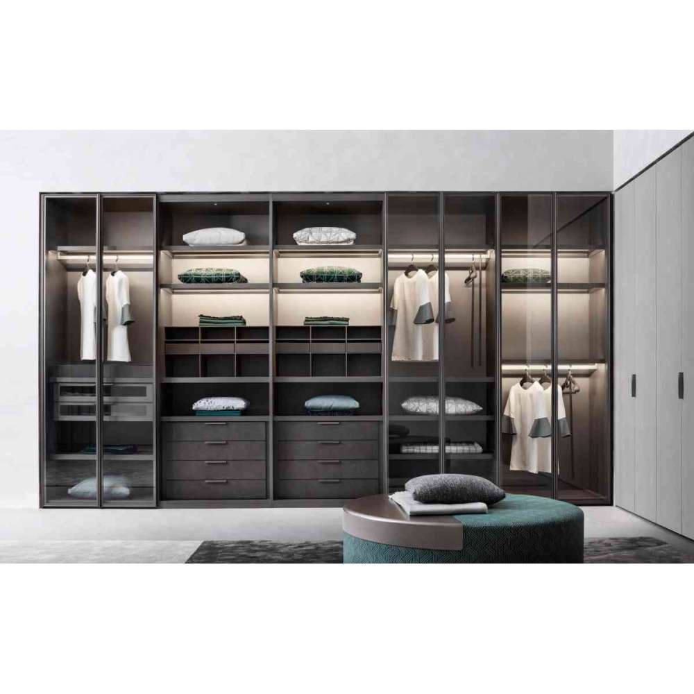 Przezroczyste szkło lub szare szkło refleksyjne, z uchwytem biegnącym wzdłuż drzwi. Drzwi te chronią i osłaniają odzież i akcesoria, jednocześnie odsłaniając je dyskretnie i elegancko.