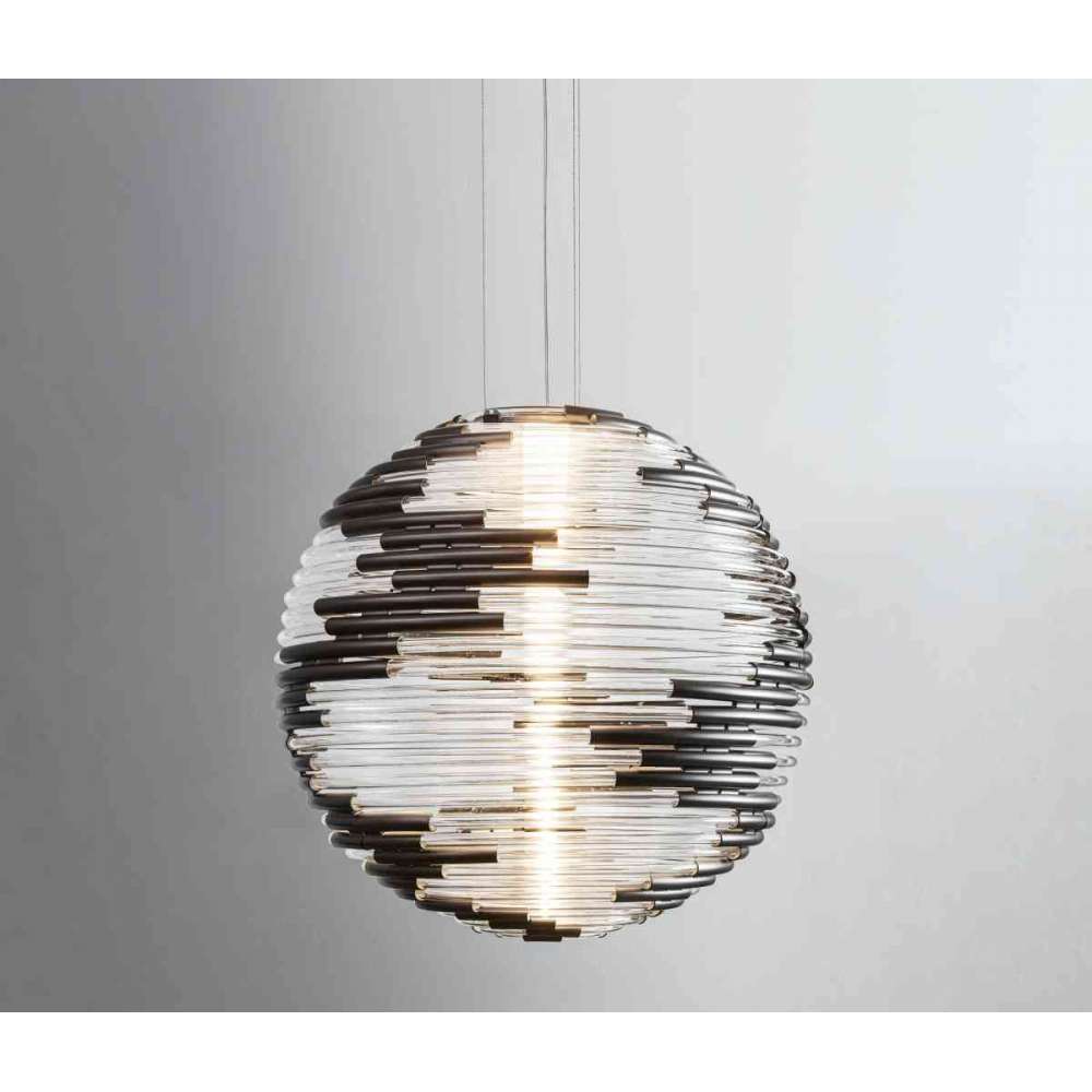 Kulista lampa w pierścieniach w rurkach ze szkła Pyrex jest podtrzymywana, jak za dotknięciem czarodziejskiej różdżki, przez nieprzezroczysty szkielet, który rozkłada się i ponownie składa wizualnie po przejściu światła.
