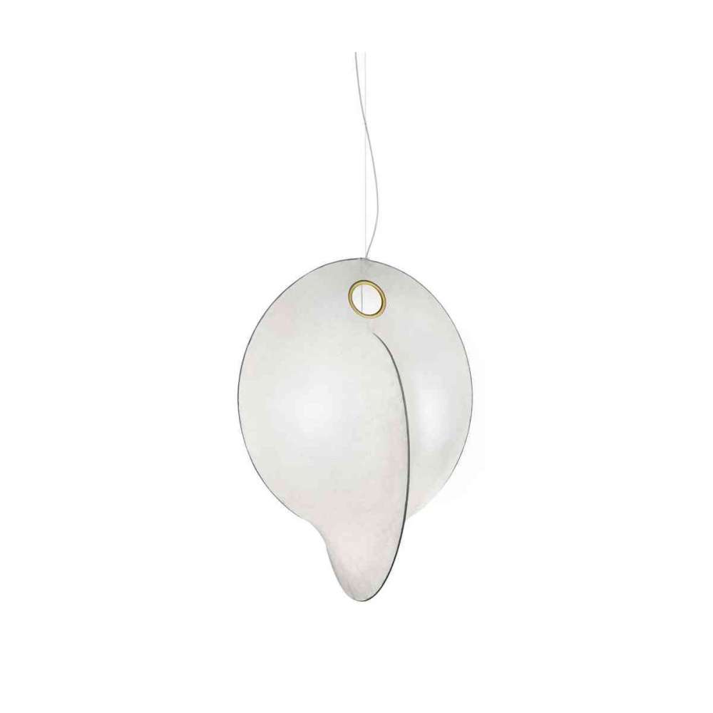 Lampa wisząca z rozproszonym światłem. Struktura wewnętrzna ze stali malowanej proszkowo na biało. Dyfuzor z żywicy Cocoon natryskiwany na konstrukcję, z przezroczystą ochroną utworzoną przez natrysk na końcu obróbki, pierścień do zastąpienia drukowanego dyfuzora stalowego w polerowanym, pozłacanym wykończeniu „Galvanic”. Odlewana róża z polerowanym Zama i pozłacanym wykończeniem „Galvanic”.