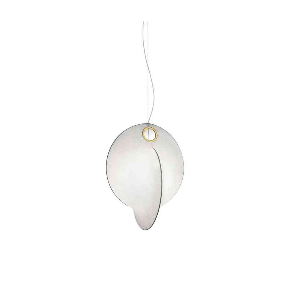 Lampa wisząca z rozproszonym światłem. Struktura wewnętrzna ze stali malowanej proszkowo na biało. Dyfuzor z żywicy Cocoon natryskiwany na konstrukcję, z przezroczystą ochroną utworzoną przez natrysk na końcu obróbki, pierścień do zastąpienia drukowanego dyfuzora stalowego w polerowanym, pozłacanym wykończeniu „Galvanic”. Odlewana róża z polerowanym Zama i pozłacanym wykończeniem „Galvanic”.