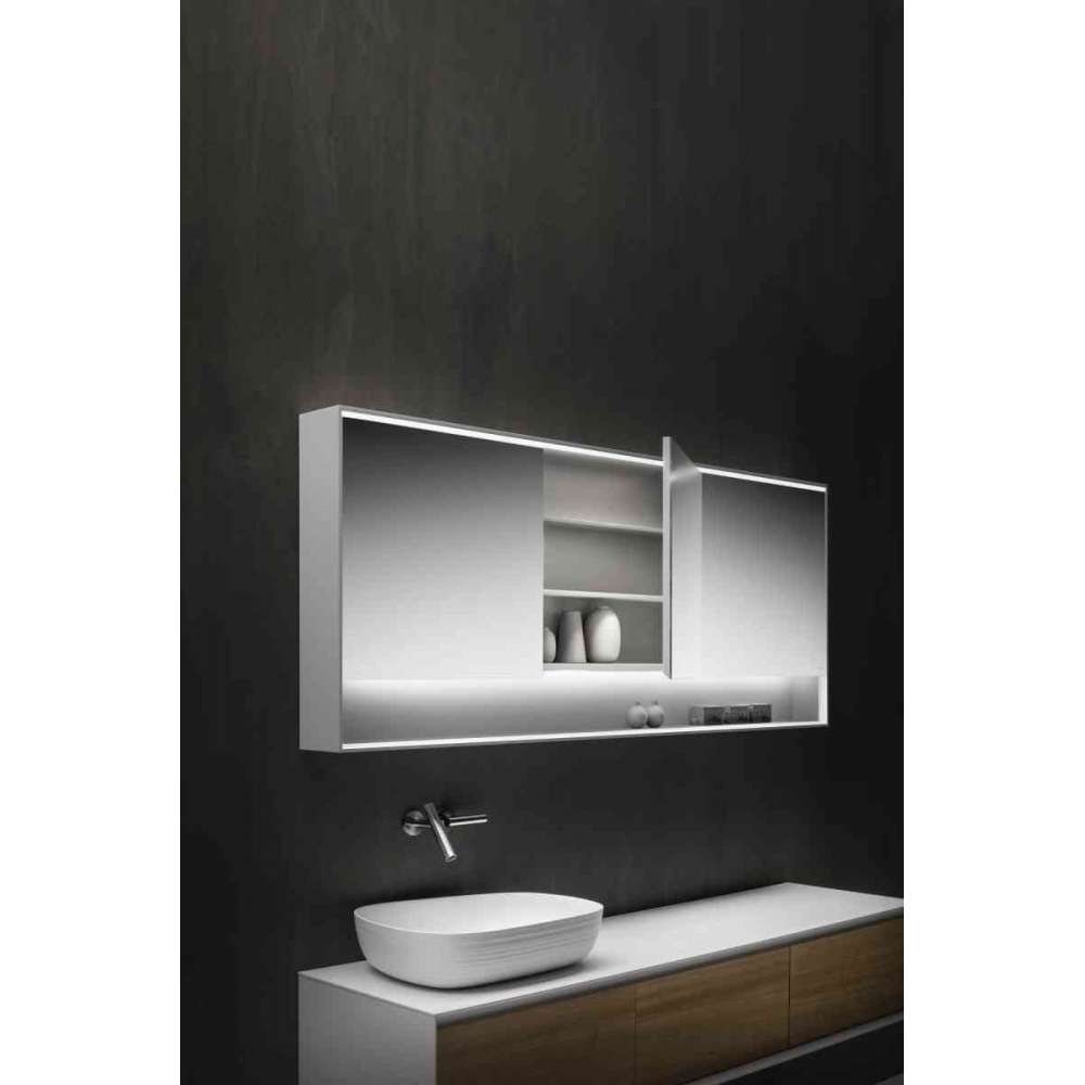 Szafka ścienna z lustrem ze zintegrowanym pojemnikiem bocznym, z przesuwanym otworem. Drewniana konstrukcja z lustrzaną powłoką z przodu i po bokach. Dostępne w różnych rozmiarach, ze schowkiem po prawej lub lewej stronie. Lustro dostępne w wersji standardowej lub przydymionej szarości. Wnętrze wykończone drewnem i lakierami matowymi z katalogu. W zestawie standardowe wewnętrzne i przednie oświetlenie LED. Projekt Robina Rizziniego ma charakter esencjonalny i kameleonowy, z w pełni odblaskową powierzchnią, ozdobioną doskonałymi detalami, dodatkami i wykonaniem.
