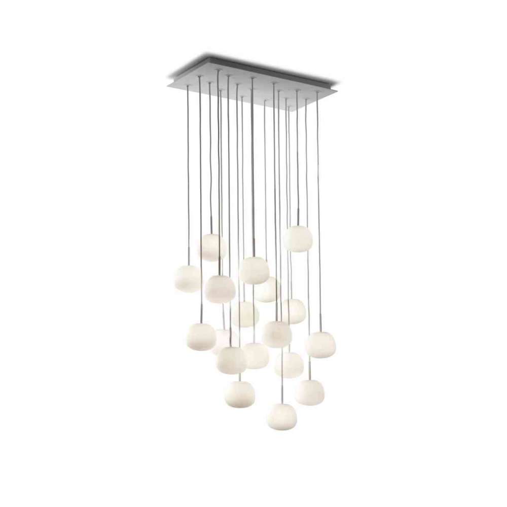 Kolekcja lamp Mochi di Saggia&Sommella została odnowiona o trzy nowe modele. „Nazwa kolekcji – wyjaśnia projektant Valerio Sommella – nawiązuje do kształtu japońskich ciastek ryżowych Mochi”. Są to tradycyjne japońskie ciastka z mielonego i ubitego ryżu, który służy do uzyskania miękkiej białej pasty, a następnie nadaje mu zaokrąglony kształt. Te same miękkie kształty zaprezentowane przez młodych włoskich projektantów w satynowym białym dmuchanym szkle dla Fabbian. W tych trzech nowych wariantach Mochi zostały odnowione i zwielokrotnione, aż teraz tworzą spektakularne wielokuliste lampy wiszące. zastosowanie mniejszych wersji.”