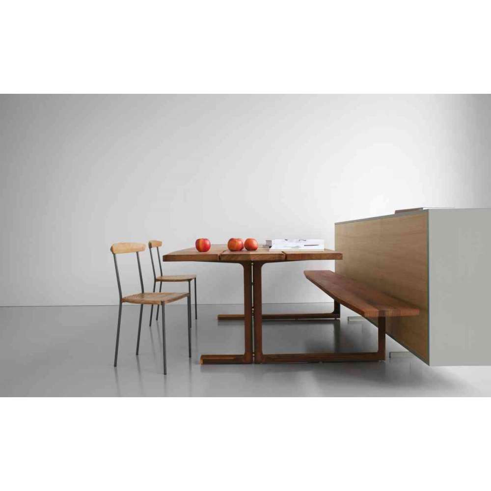 Zaprojektowany bez kompromisów do użytku na zewnątrz, jest dostępny w wykończeniach z litego orzecha i dębu do użytku w pomieszczeniach. W wersji na zewnątrz blat i krzesła są pokryte olejem naturalnym Iroko, rama ze stali kortenowskiej lub stali malowanej proszkowo. Elementy stolarki wykonane są ze stali nierdzewnej lub mosiądzu.