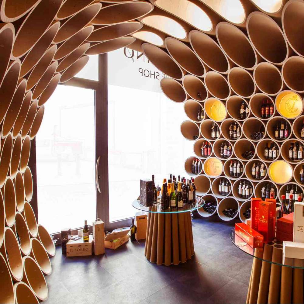 Esigo 8 szyty na miarę, stojak na wino w tubach kartonowych dociętych na wymiar na wyjątkowy mebel w ekskluzywnej piwniczce z winami.