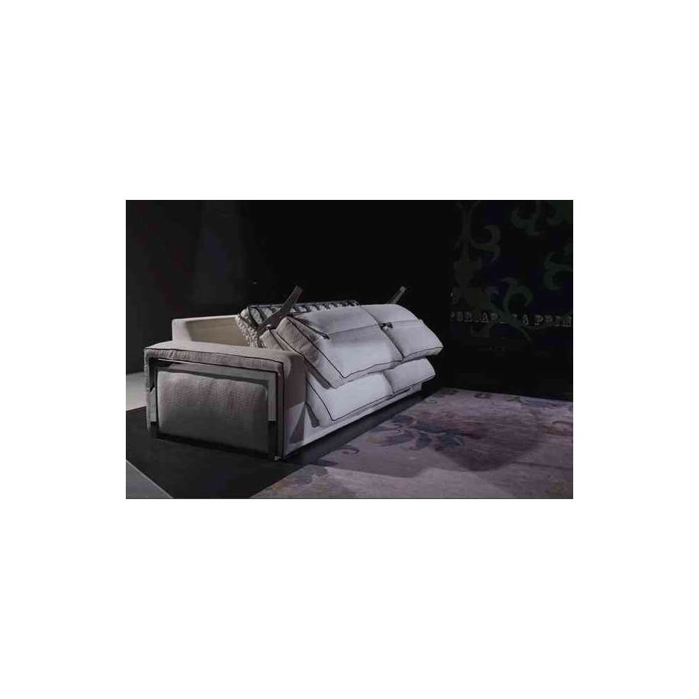 Konstrukcja z litego drewna i sklejki, pokryta z pianką poliuretanową. Poduszki siedziska z ekspandowanego poliuretanu + gęsi puch. Poduszki oparcia z gęsiego puchu. Podłokietnik / podnóżek z metalu z polerowanym chromowanym wykończeniem. Stelaż łóżka posiada drewniane listwy, natomiast w części końcowej skrzyżowane elastyczne paski, które zapewniają odpowiedni komfort siedzenia. Nieodkształcalny materac z pianki poliuretanowej h. cm. 12 pokrytych hipoalergiczną bawełną / włóknem poliestrowym. Model jest dostępny w tkaninie, całkowicie zdejmowany lub w skórze.