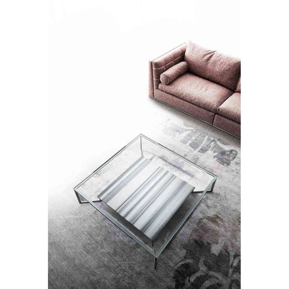 Niski stolik kawowy do salonu, lekki i funkcjonalny. Ma skrzyżowaną stalową konstrukcję z polerowanym chromowanym wykończeniem. Górny blat jest z kryształu, a dolny z marmuru: biała Carrara, Nero Marquinia, Port Laurent, Rosa Portugal i White & Black. Wymiary cm. 95x95xh. 31,5 lub cm. 117x117xh. 31,5