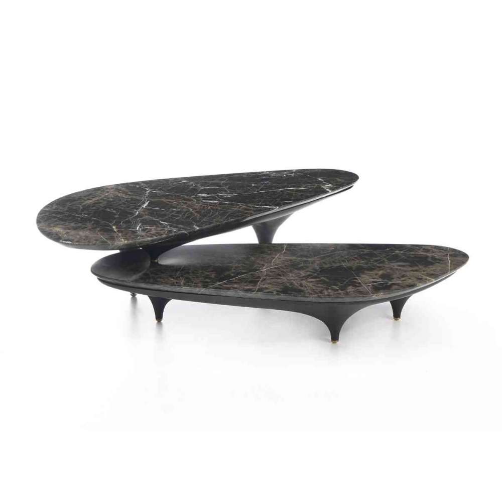"Tabaka" składa się z zestawu minimum dwóch stolików. Podczas gdy niski stół jest wolnostojący, drugi stół znajduje się na górze z jednego punktu obrotu. Liczba punktów obrotu może zostać zwiększona na życzenie, co pozwala na dodanie warstw stołu o różnej wysokości, aby stworzyć bogatszą kombinację i służyć różnym celom. Kroplowa forma nóg jest kontynuacją korpusu, uzupełnioną organicznym marmurowym blatem.