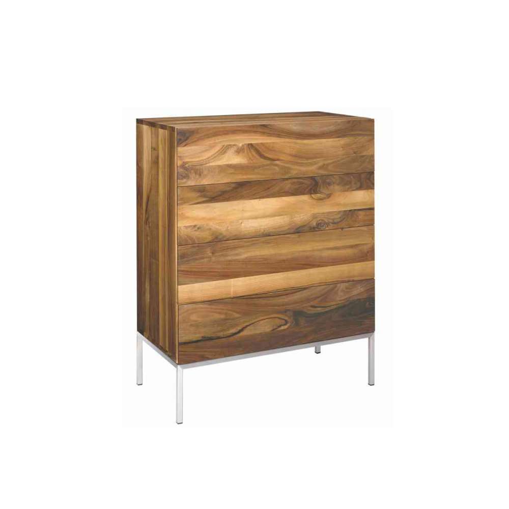 Elegancka komoda z litego drewna FATIMA to wyrafinowany mebel eksponujący niepowtarzalne wzory słojów litego drewna. Boki szuflad zakończone są skosem pełniącym funkcję uchwytu. Rama wykonana ze stali nierdzewnej szczotkowanej lub malowanej proszkowo.