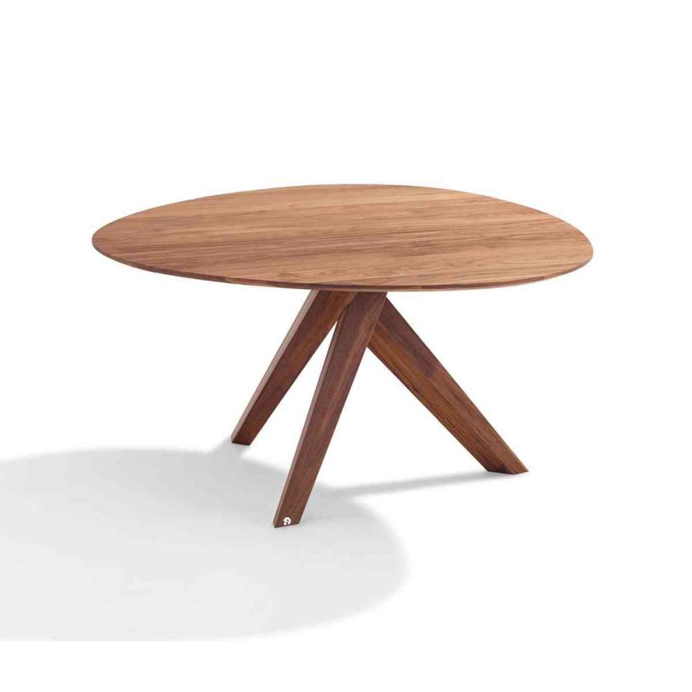 Forma blatu stołu TRILOPE opiera się na „trójkącie Reuleaux” (znanym również jako „trójkąt sferyczny” lub „rotor Reuleaux”). Widok z góry został zaokrąglony i wyszlifowany zgodnie z zasadami sztuki geometrycznej, dzięki czemu gładki wygląd blatu zachęca do pozostania przy stole. Blat przypomina okrągły stół, ale z innowacyjną optyką i większą obecnością i wyrafinowaniem. Podstawa składa się z trzech wyraźnie wysuniętych nóg z litego drewna, które są połączone stycznie. Dzięki temu łączą w sobie fascynujący wygląd z najwyższą stabilnością.