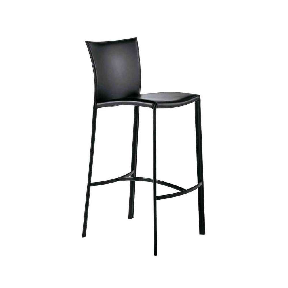 Stołek barowy z lakierowanym na czarno lub chromowanym usztywnieniem w dolnej części. Siedzisko i oparcie oraz nogi w całości pokryte skórą rdzeniową. Model ten dostępny jest w dwóch wysokościach. 7 różnych kolorów skóry rdzenia do wyboru, każdy z kontrastowymi lub identycznymi szwami stebnowanymi.