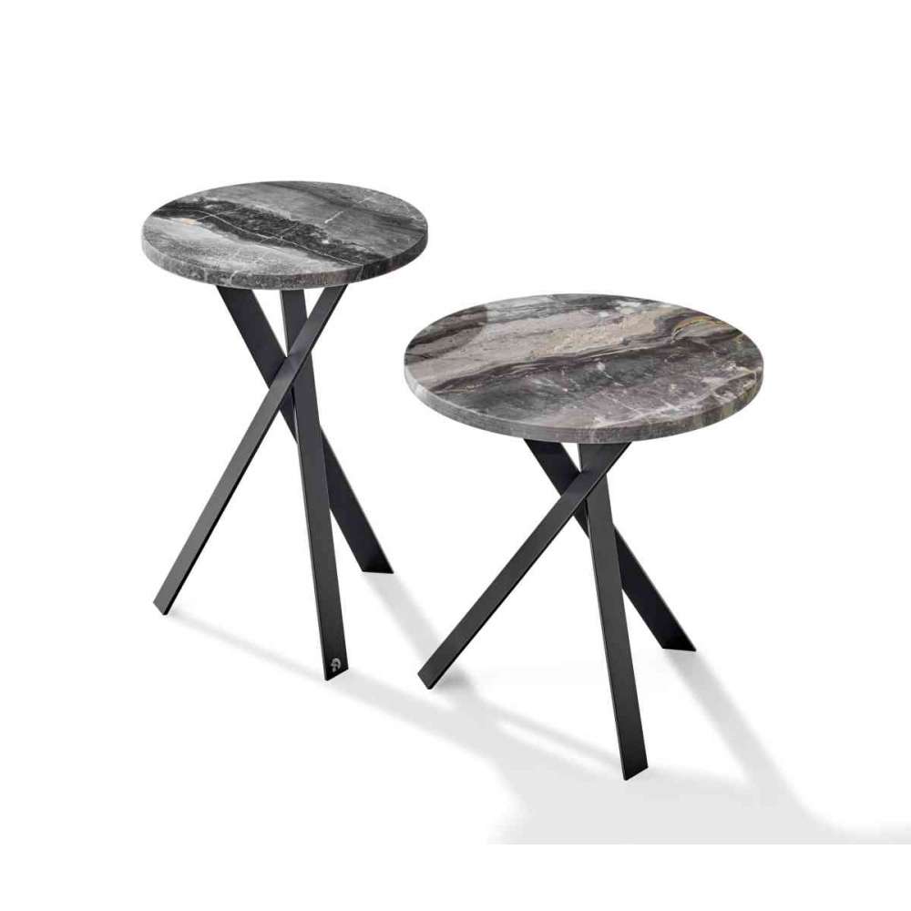 Mały stolik boczny ze stalowym cokołem pokrytym czarno-szarym blatem i płytą z kamienia naturalnego pokrytą matową skórą.
