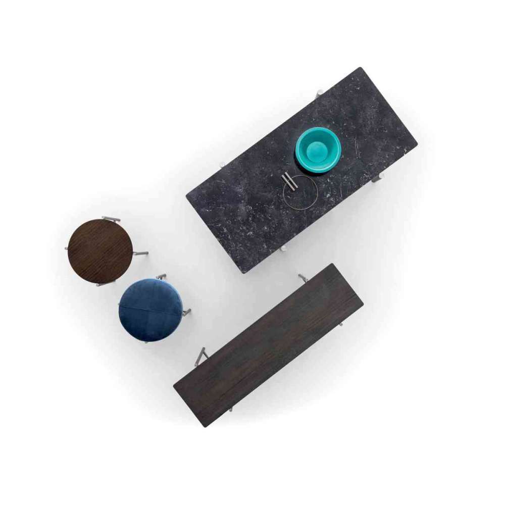 Kolekcja uzupełniających się mebli o różnych kształtach i rozmiarach z metalową ramą i blatami z drewna lub marmuru żyłkowanego. Duże i niskie stoliki przed sofami, wąskie i długie regały na książki, które je otaczają, okrągła pufa i małe biurko do wyposażenia i uzupełnienia części dziennej.