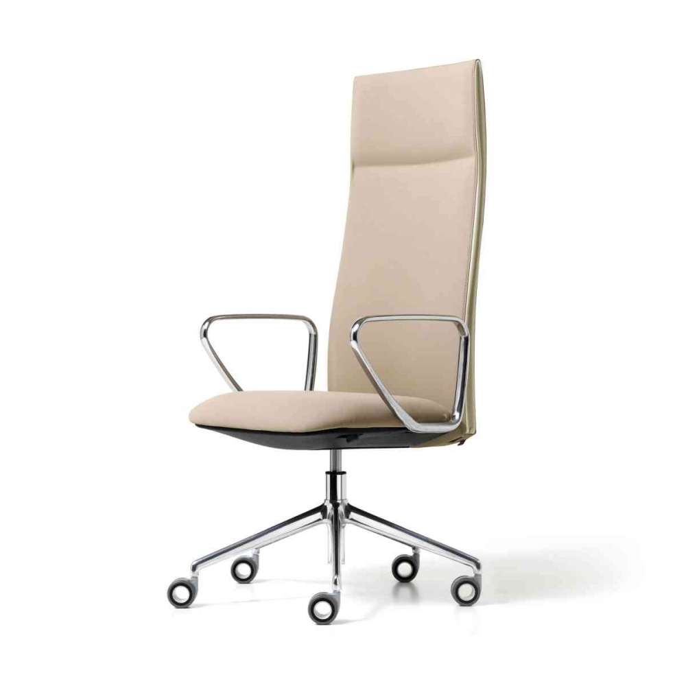 lakierowane lub ponownie wyściełane i tapicerowane. Podstawa z polerowanego aluminium lub czarnego nylonu z pięcioma ostrogami ma samohamowne kółka. W przypadku wersji przeznaczonej na spotkania dla gości, oparcie jest średniej wysokości i do wyboru: podstawa polerowana z czterema ostrogami