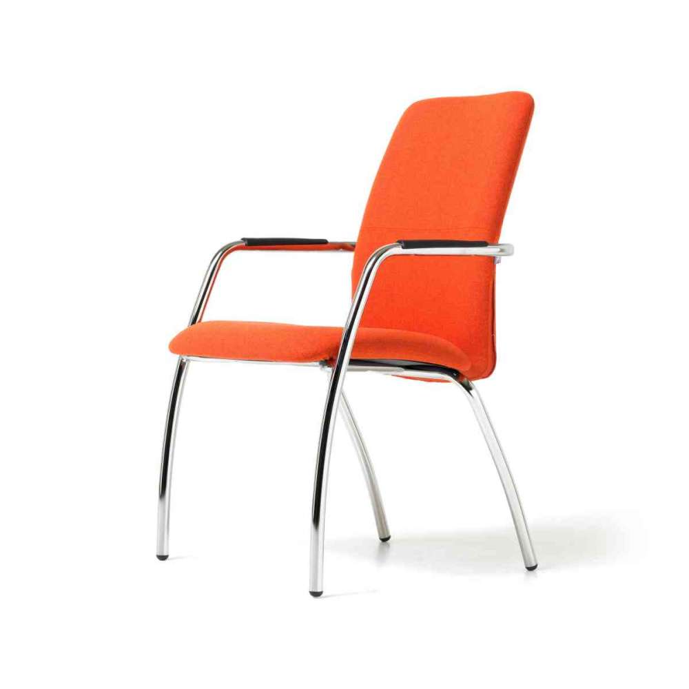 tapicerowane. Chromowana rama wspornikowa lub 4 nogi, ze stałymi ramionami i ramionami osłonowymi z polipropylenu. Możliwość układania w stos.