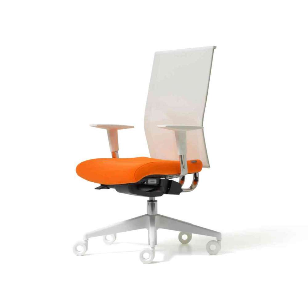 Fotel obrotowy, oparcie z siatki w kolorze białym lub czarnym, regulacja wysokości, chromowane detale.