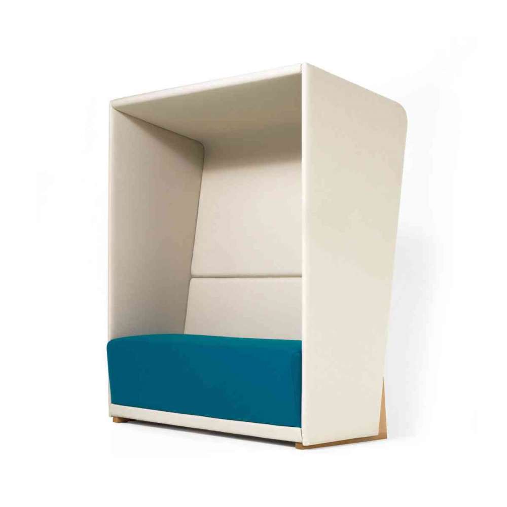 2-osobowa sofa i fotel, z wysokim oparciem, charakteryzująca się nowoczesnymi kształtami i odpowiednia do otoczenia wymagającego prywatności. Wnętrze z drewna i wyściółka z pianki poliuretanowej. Nogi dębowe, lakierowane naturalnie.