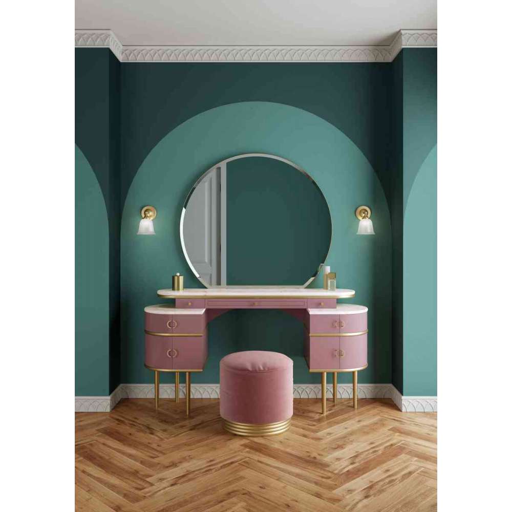 Blat, podzielony na trzy części, aby zrobić miejsce na wszystko, co potrzebne do makijażu i włosów, jest z marmuru cremo-extra i jest świetlisty w swojej szczerości z bladożółtymi smugami. Drzwi i szuflady wykonane są z lakierowanego drewna w intensywnym pudrowym różu z nutami malwy, odcieniu różu, który Zelda Fitzgerald uwielbiała i o którym często mówiła w swoich narracjach, kojarząc go z wyjątkowym i niepowtarzalnym kolorem chmur tuż przed nieoczekiwanym burza.