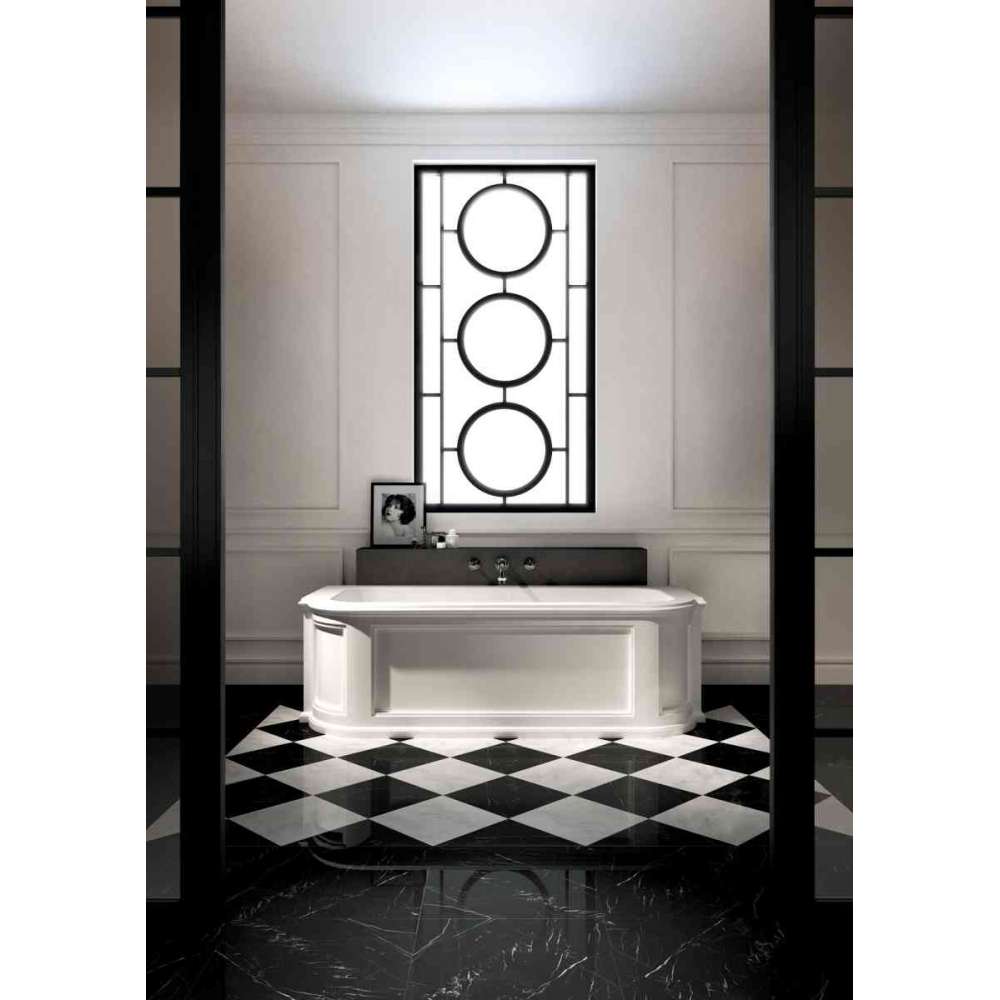 Imponująca jednobryłowa wanna w stylu neoklasycystycznym o wyraźnie prestiżowym charakterze. Jego rzeźbiarską elegancję podkreślają rygorystyczne geometryczne projekty płaskorzeźb. Dostępna jest również w wersji prawego lub lewego narożnika i może być wzbogacona o cenne elementy dekoracyjne z białego marmuru Carrara lub czarnego Marquina.