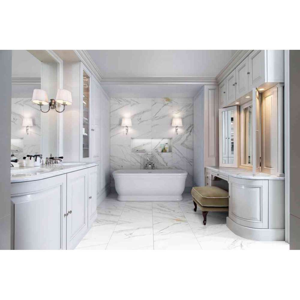 Prostokątna, wolnostojąca wanna, która ma być eleganckim punktem centralnym każdej łazienki, niezależnie od tego, czy zostanie umieszczona na środku łazienki, czy przy jednej ze ścian.