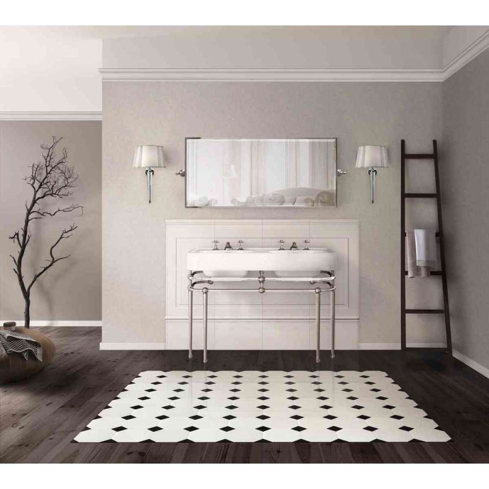 Przezroczysty element z pleksiglasu nadaje nowoczesny wygląd klasycznej kompozycji tej dużej konsoli. Konstrukcja nośna z toczonego mosiądzu z chromowanymi, jasnozłotymi lub polerowanymi wykończeniami niklowymi podtrzymuje elegancki ceramiczny zlew z dwiema dużymi owalnymi umywalkami. cm dł.: 124,5 x wys.: 88,3 x gł.: 56,5