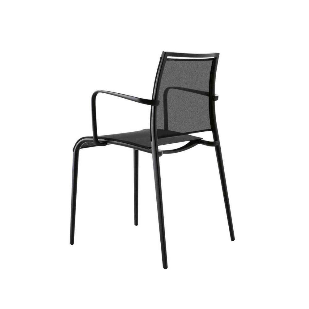 Krzesło sztaplowane z podłokietnikami lub bez, rama z odlewanego ciśnieniowo aluminium. Siedzisko i oparcie z siatki wykonanej z nici poliestrowej pokrytej PVC (Sand Air) oraz PVC + konopie (Sand Air Canatex / Duo) w różnych kolorach.