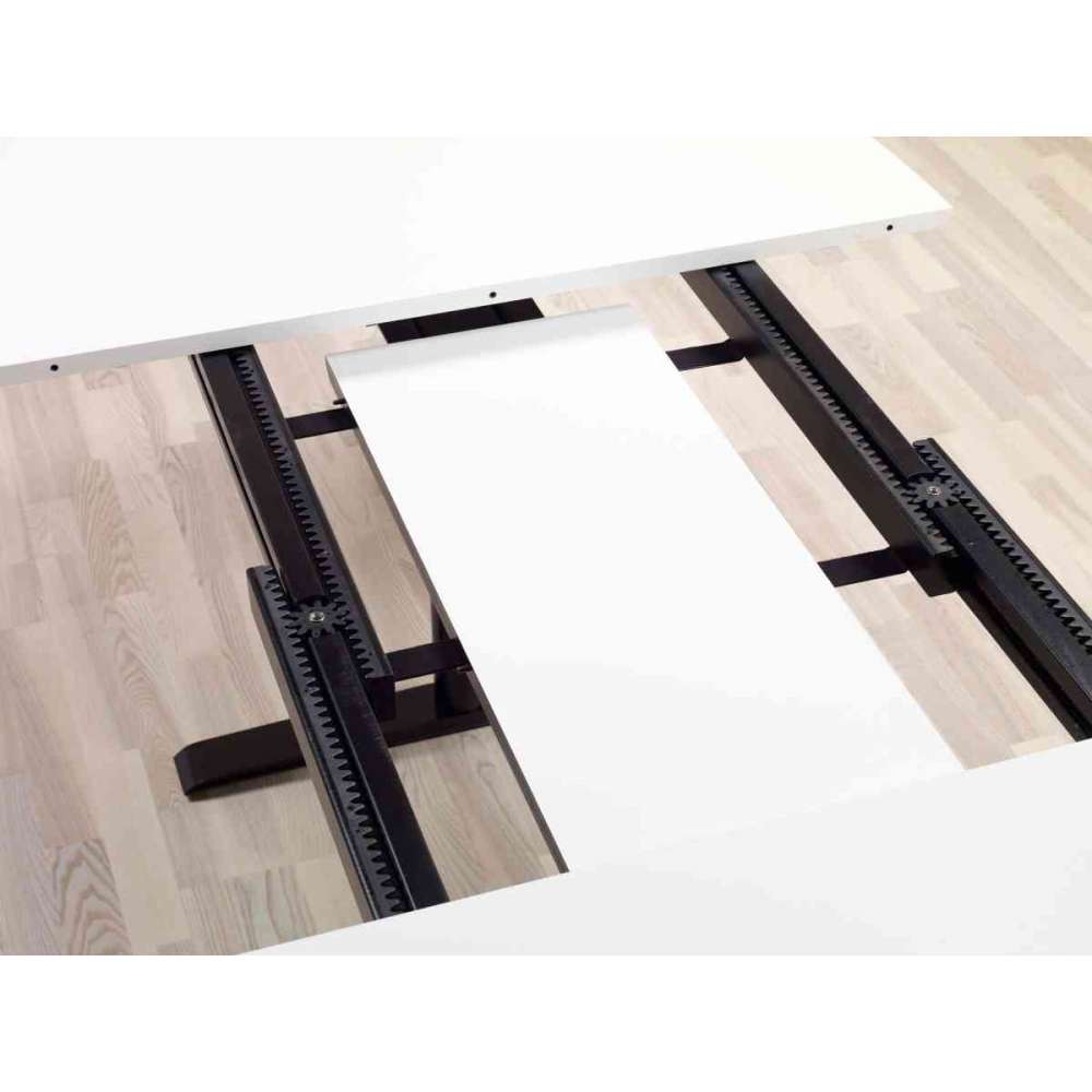 Detal wysuwanego stołu synchronicznego Quadro. Stół konferencyjny z synchronicznym wysuwaniem i półką na dwa dodatkowe blaty. Rama Quadro ze stali malowanej proszkowo na czarno z blatem ze standardowego laminatu w kolorze białym z 3 x białym lakierem na wszystkich krawędziach.