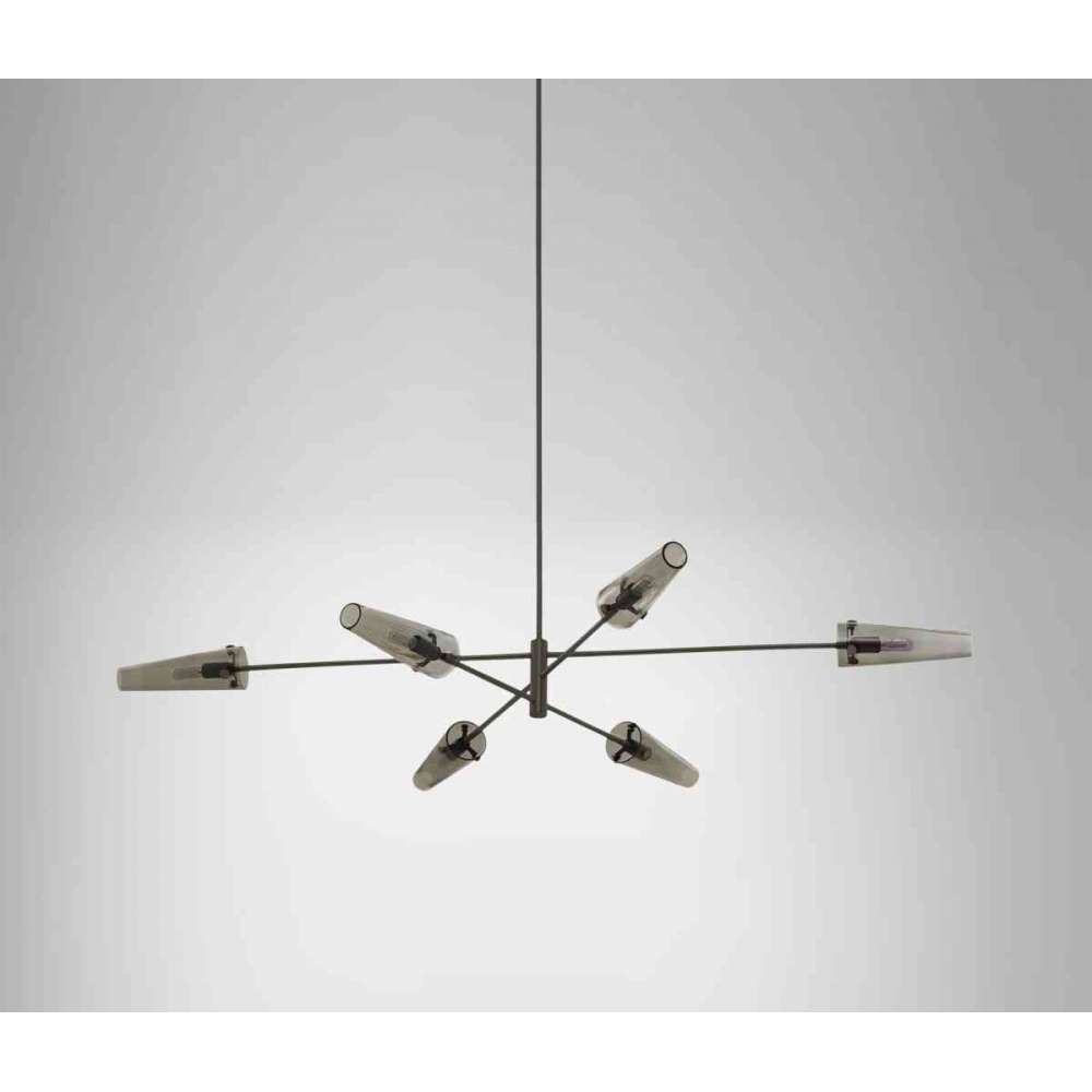 Nowoczesna ozdobna lampa wisząca, inspirowana zabytkowymi latarniami ulicznymi, która łączy linearną formę z dekoracyjnymi detalami, tworząc unikalną kombinację, która jest wspaniałym elementem centralnym wnętrza. Wykończone satynowym mosiądzem lub brązem ze stożkowymi kloszami z dymionego szkła.
