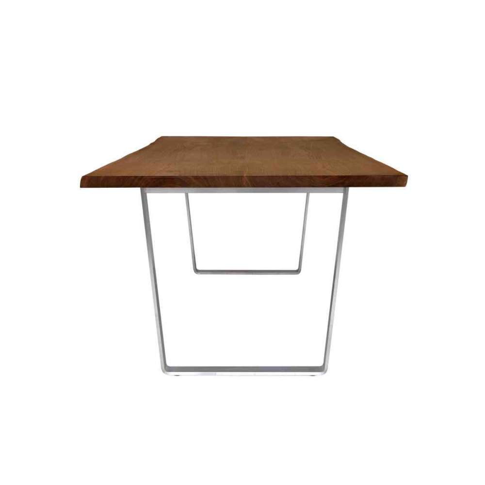 Imponujące naturalne kłody spotykają się ze szczotkowaną stalą nierdzewną – blat z prawdziwego drewna niemal unosi się na elegancko ukształtowanej podstawie.