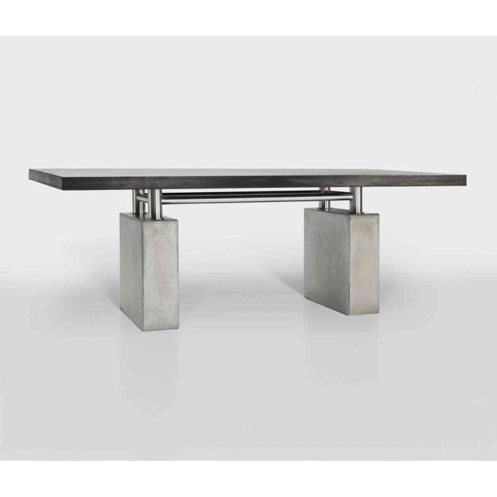 Prosta i skromna architektura stołu przywodzi na myśl surowe budowle megalityczne. Jest szczery i prawdziwy, bez żadnych dziwacznych efektów i zbędnych ozdobników. Od materiałów zależy wartość i siła wyrazu przedmiotu. Używane świadomie, zgodnie z architektoniczną logiką projektowania, decydują o jego jakości i dostojności. Betonowe bloczki, które służą jako nogi stołu i stanowią jego fundament, odlane są ze specjalnego betonu, który nie pyli. Solidne ramy wykonane z wysokogatunkowej stali nierdzewnej zapewniają stabilną konstrukcję. Stół pokryty jest masywnym blatem wykonanym z naturalnego fornirowanego i lakierowanego drewna.